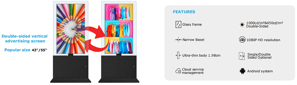 Strong visual impact: The unique double-sided vertical structure, combined with dynamic advertising content played simultaneously, can instantly capture the audience's attention and create a more stunning visual effect compared to ordinary single-sided advertising screens, standing out among numerous advertisements and significantly increasing advertising attention.