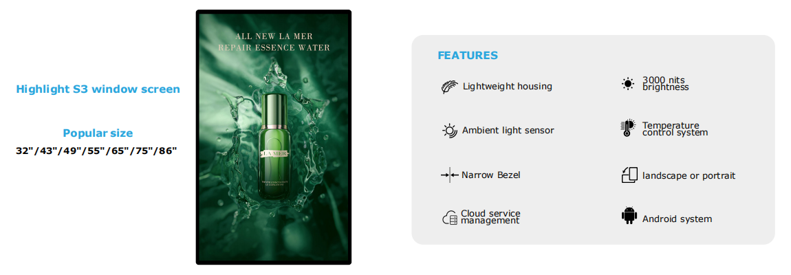 Store image and atmosphere creation:  As a window for external display of the store, the advertising screen can enhance the overall image of the store and convey brand positioning and style to the outside world by playing high-definition and exquisite brand promotional videos, product close-up videos, etc. The dynamic advertising screen constantly switches, creating an active and fashionable commercial atmosphere, attracting passersby to enter the store, and increasing the foot traffic of the store.
