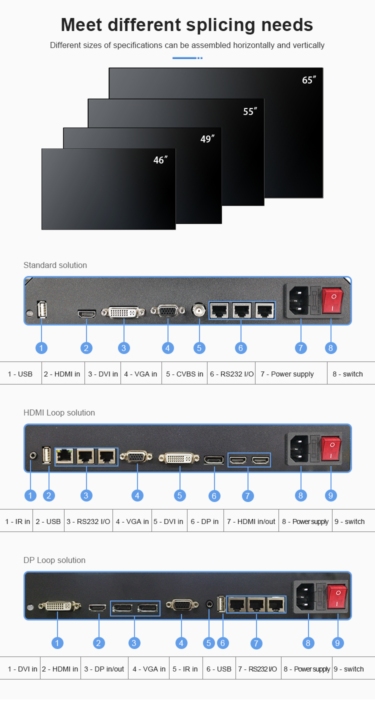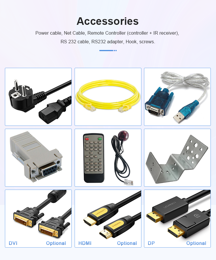 Input | HDMI/DVI/VGA/CVBS/RJ45(rs232)/USB, (optional) | ||