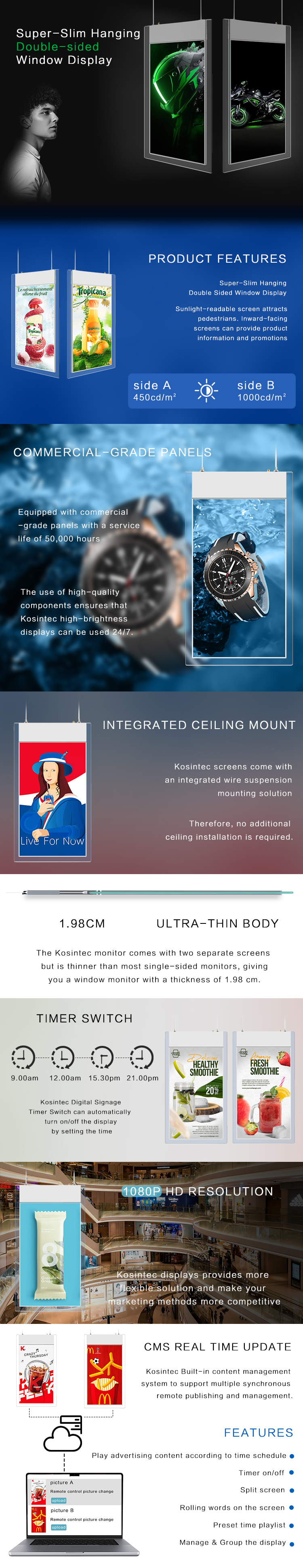 Shenzhen kosintec Co., Ltd has gained a remarkable position in the concerned industry through years of efforts, and there is a great possibility that the company will achieve a greater advancement in the future. High-end technologies are used to manufacture Kosintec 55inch Hanging Display Double Sided Lcd Advertising Player Digital Window Signage.The product can play out its greatest effect in the field(s) of Digital Signage and Displays. Shenzhen kosintec Co., Ltd are full of passion for what we are doing now. Nurtured by the corporate culture of unity and integrity, every employee is optimistic and constantly looking for more and better methods to manufacture the products. Our vision is to create benefits for our partners and customers.