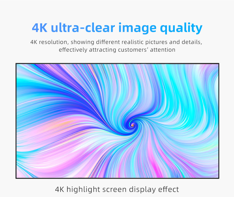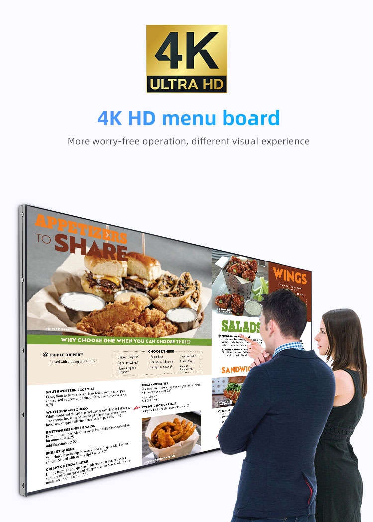 After years of development, Shenzhen kosintec Co., Ltd has gained strong capabilities in production and R&D, which allows us to develop new products to keep close up with industry development. We offer buyer 65 Inch Digital Menu Board Advertising Display With High Resolution,High Brightness For Restaurant that they need at prices that fit their pocket. Having analyzed the industry dynamics and researched the market development, we ensure our LCD video walls, digital shelf displays, digital menu boards, and high brightness digital signages has advantages in both its appearance and performance. It is designed to be of a unique structure and look, making it highly attractive to potential customers. In addition, the features of our 65 Inch Digital Menu Board Advertising Display With High Resolution,High Brightness For Restaurant makes it more valuable.