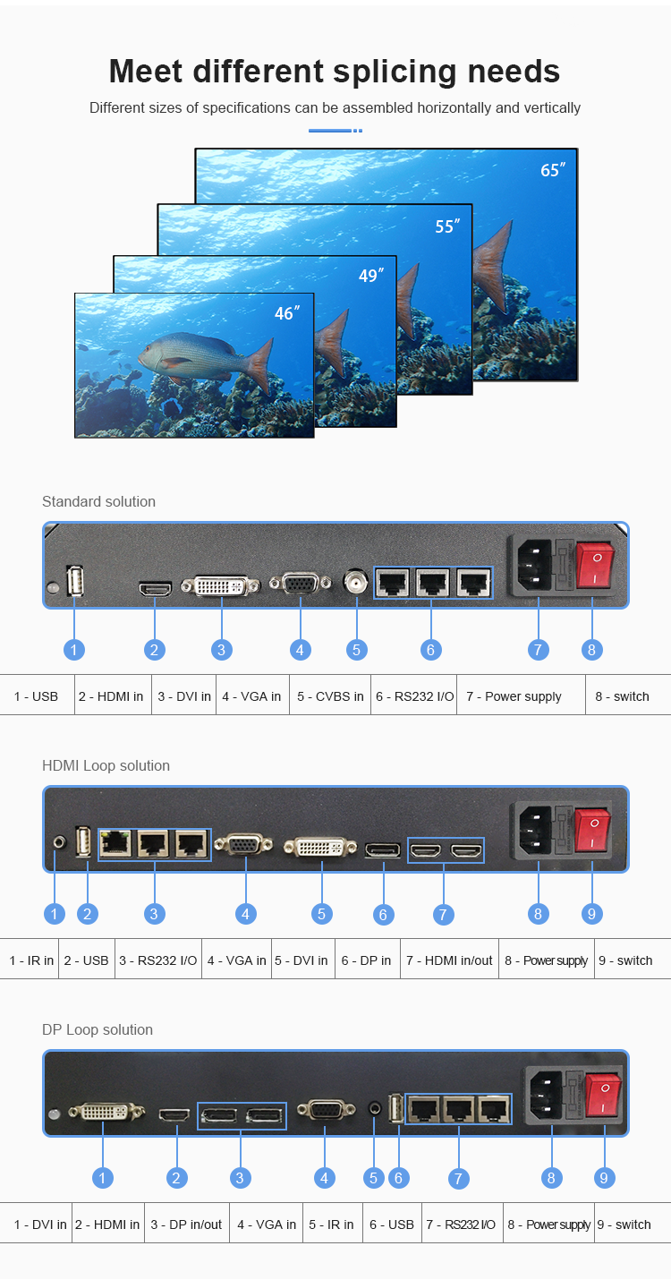 Input | HDMI/DVI/VGA/CVBS/RJ45(rs232)/USB, (optional) |