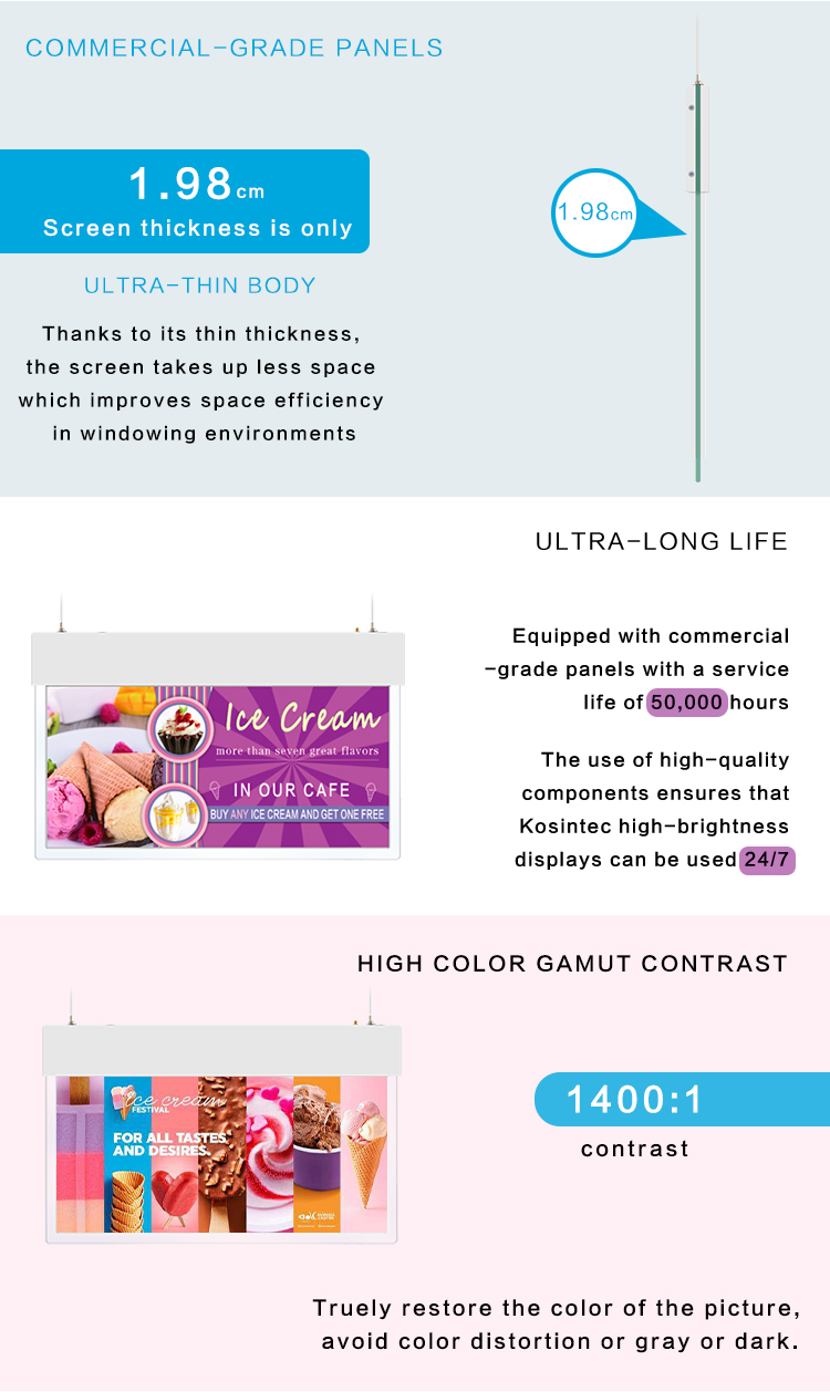 Konsintec Double Sided Window Display attracts attentions of pedestrians with the outward, sunlight readable screen.