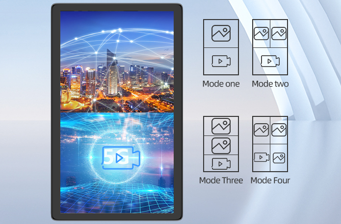 Kosintec 21.5 inch wall mounted display supports a variety of split-screen forms, and can play pictures and videos at the same time: online and Android versions can support more than 20 split-screen methods, and the split-screen area can be adjusted by itself.