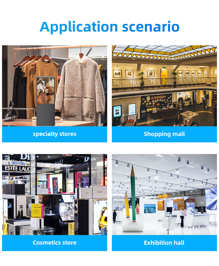 xuất bản quảng cáo, cửa hàng bán lẻ, trung tâm mua sắm, trưng bày các món ăn, trưng bày chào mừng, kinh doanh tự phục vụ, phòng triển lãm, tìm đường, sân bay, tàu điện ngầm, thang máy, Nhà hàng & Đồ dùng khách sạn, giáo dục, điều trị y tế