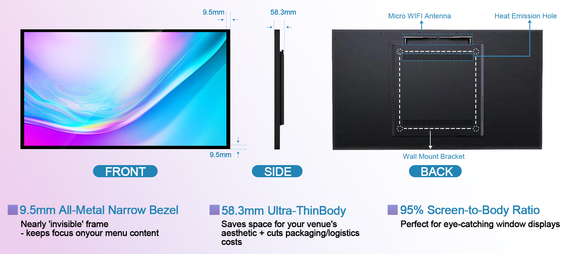 That’s why narrow bezel digital signage displays are one of the top choices for restaurants, cafés, and fast-food chains.